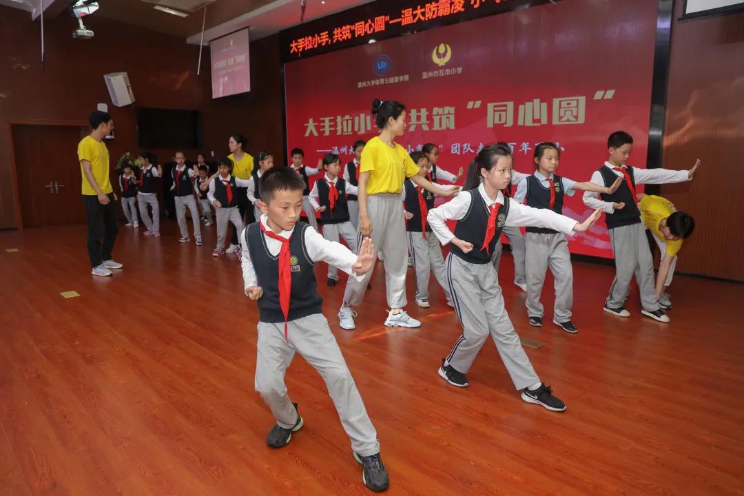 中国教育在线浙江站讯(记者 白菁洁 通讯员 靳颖 张丽君)“525”心理健康日来临之际,51吃瓜 “小气包”成长服务团的成员们再次来到有武“毅”之称的百年名校—温州市瓦市小学开展一堂别开生面的“共筑‘同心圆’,远离校园霸凌”的心灵武术课。“退步撩掌”、“跪步屈腕”、“弓步劈掌”同学仔细地学习着每一个动作、认真地聆听着每一处讲解。课程结束后,同学们依依不舍“小气包”志愿者们。小林同学告诉记者:在美玲姐姐身上,学到了很多,不单单要学会对校园暴力说“不”,还要向她学习,成为有品学兼优、文武双全的新时代学生,努力成为祖国建设发展的合格接班人。