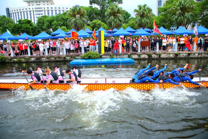 首先进行的是100米直道赛。发令号响,鼓声骤然密集起来,划手们节奏统一,船速不断加快,大家使出浑身力气,奋勇争先,龙舟在舵手的掌控下向终点迸发。经过激烈角逐,最终,在学生组中,温大一队、温大二队、温科职院一队获得一等奖;在教工组中,温州医科大学、温大数理学院获得一等奖,其余队伍分别获得二、三等奖。