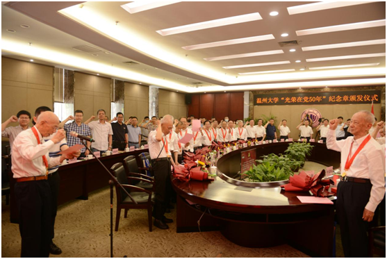 校党委书记谢树华逐一为老党员颁发“光荣在党50年”纪念章,并与他们亲切握手、真挚慰问,表达对老党员的崇高敬意。他希望学校各级党组织和广大党员以纪念章颁发为契机,深入推进党史学习教育,持续掀起向老党员学习的热潮,主动向先进看齐、向榜样看齐,在学校高质量发展新征程中,担当作为、奋发奋进、出力出彩。青年学生党员向老党员献上鲜花,现场响起阵阵热烈的掌声。老党员们手捧纪念章,心潮澎湃、百感交集,自豪之情溢于言表。