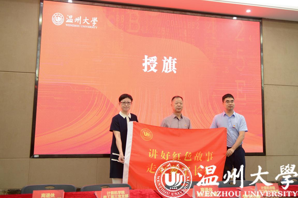 当离退休党委书记、干部处处长陈慧,计算机与人工智能学院党委副书记、院长张笑钦从吴金法书记手中接过旗帜时,张笑钦院长激动表示:“这面沉甸甸的旗帜,代表着党委的殷切嘱托,我们定将从党史中汲取奋进力量,传承红色基因,讲好老党员的红色故事,走好新时代的数字长征,让红旗高高飘扬……”