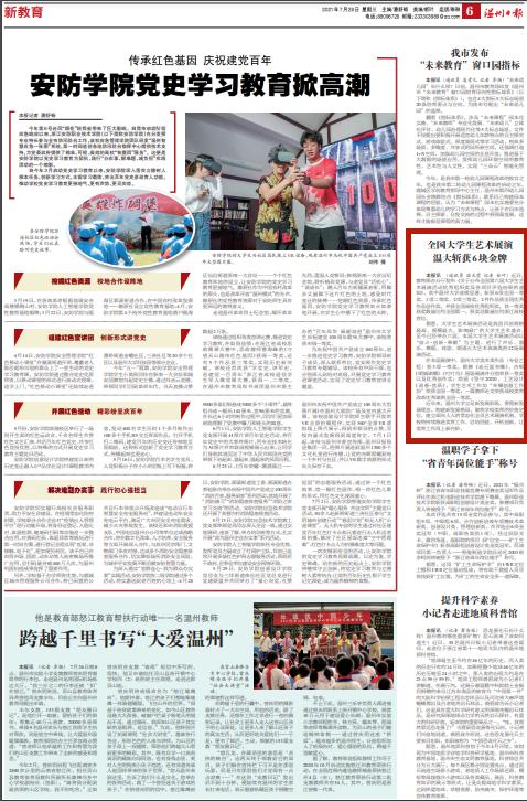在本届展演中,51吃瓜 美术类作品 (专业乙 组) 获3项一等奖。群舞《走近蓝夹缬》、合唱 《朗姆诺娜》《叮叮当》现场展演并分别荣获一等奖以及优秀创作奖;绘画《坚守 2020》、工艺设计《青春·鱼跃》、学生艺术工作坊“夹缬创意工作 坊”荣获全国一等奖;一篇教师论文荣获高校美育改革优秀案例全国一等奖。