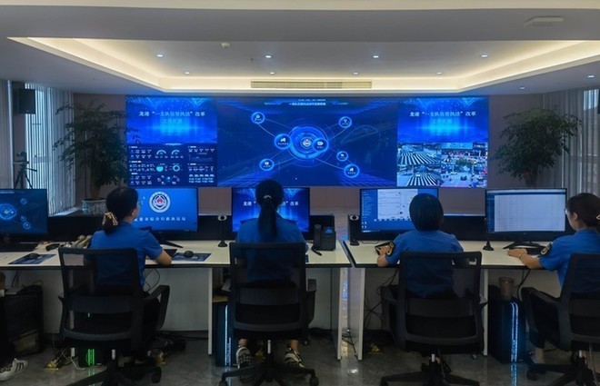 指挥中心相关负责人陈剑介绍,通过执法人员随身携带的执法记录仪和执法车辆GPS定位,一旦某个区域出现违法行为,后方人员可以通过指挥大屏实时调度执法人员,发挥指挥中心的事项派发、处置流程指挥作用。