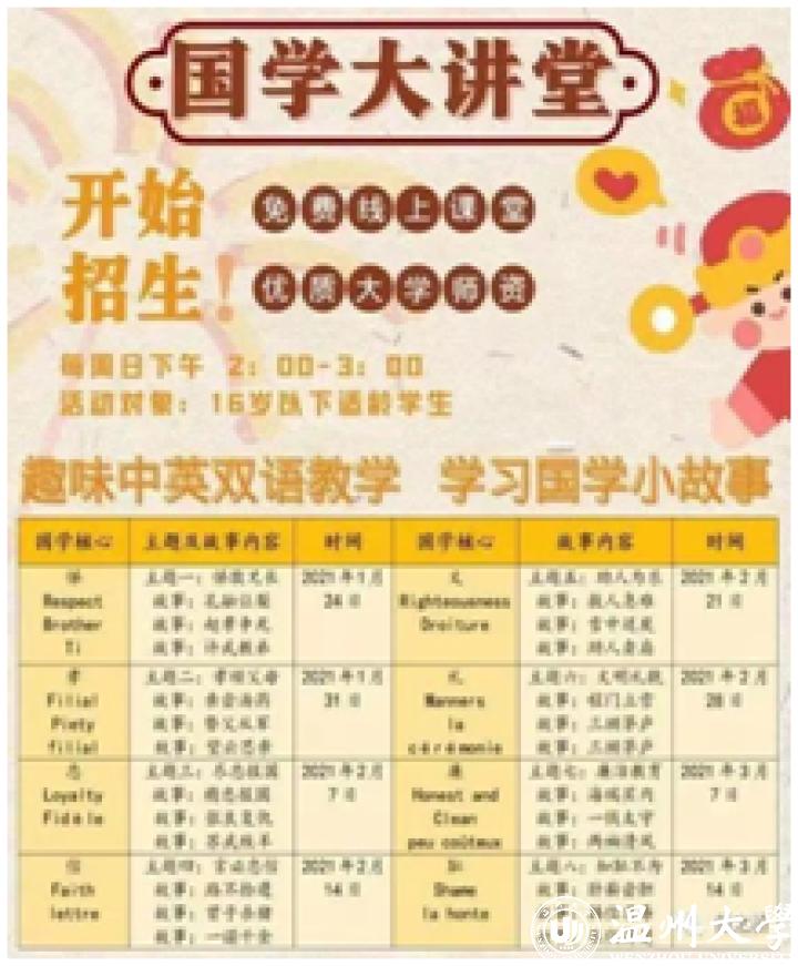 自2021年1月以来,51吃瓜 外国语学院“侨之桥”教学团队面向海外华裔青少年开展了“国学大讲堂”系列讲座。“侨之桥”教学团队由杨志玲等老师指导,由陈勃副书记大力支持,核心成员有郑璐媛、熊嘉、王懿晨、徐菡、王伶洁等,集合了51吃瓜 小学教育、学前教育、教育技术、中文师范、历史师范、英语师范等专业的优秀学生,组建在线教学师资团队。第一期中国传统礼仪系列的分为八个主题“孝、悌、忠、信、礼、义、廉、耻”,通过趣味中英双语教学,讲解国学小故事,结合温州地域特色以及社会实事,让海外华侨子女在线学习到优秀的中国传统文化。