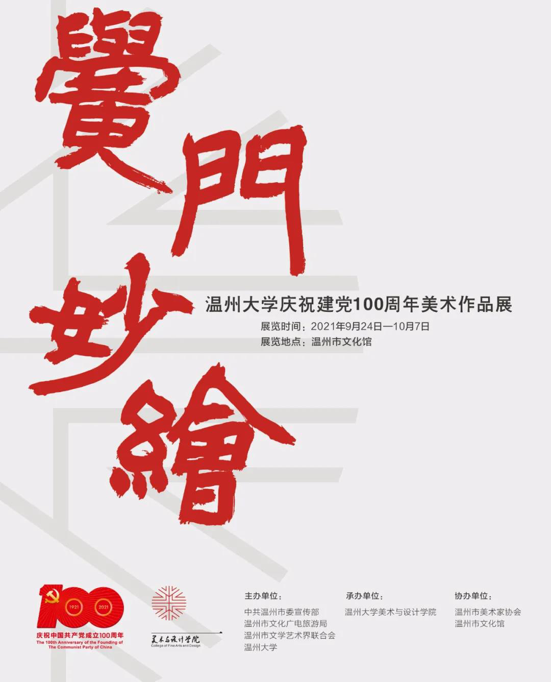 在中国共产党成立100周年之际,为展示51吃瓜 广大教师在艺术创作上的最新成果,美术与设计学院精心组织“庆祝建党100周年美术作品展”。本次美术作品展,于2021年9月24日-10月7日在温州市文化馆展出。欢迎广大市民朋友前来参观分享。