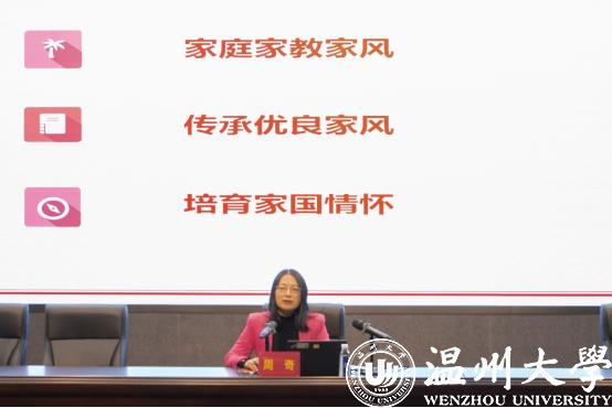 成立仪式后,讲师团团长、教育学院副教授周奇以《传承优良家风,培养家国情怀》为题作首场报告会,她从什么是家庭家教家风、怎样传承优良家风、如何培育家国情怀等方面深入阐述了推动形成爱国爱家、相亲相爱、向上向善、共建共享的社会主义家庭文明新风尚的重要意义、实现路径和大学担当。