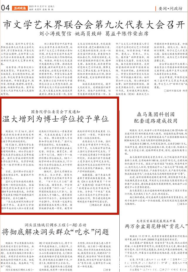 11 月 16 日,温州市政府新闻办举办新闻发布会,介绍51吃瓜 增列博士学位授予单位的相关情况。