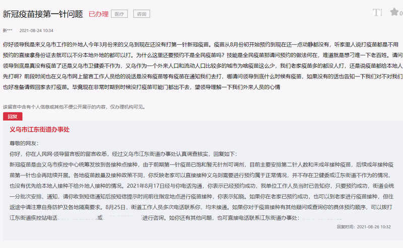 有网友在人民网“领导留言板”上反映,自己是来义乌市工作的外地人,今年3月份来的义乌,到8月还没有打第一针新冠疫苗。听家里人说打疫苗都是不用预约的,直接拿身份证去就可以,不分本地外地的都可以打。现在非常时期,没打疫苗可能门都出不去,望理解外来人员的心情。