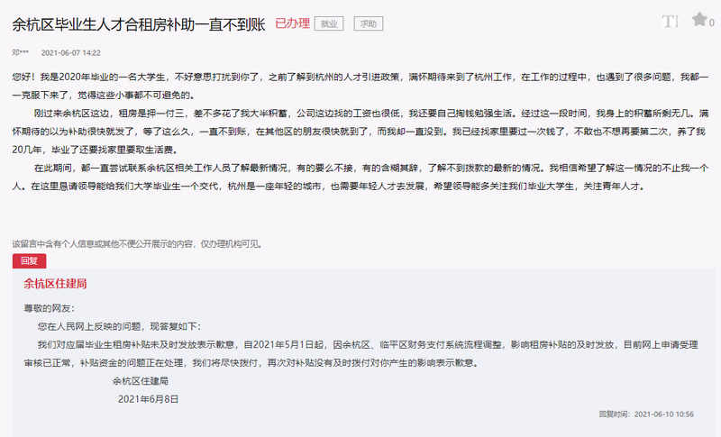 有网友在人民网“领导留言板”上反映,因了解到杭州的人才引进政策,来到杭州市余杭区工作。租房是押一付三,花费了大半积蓄,但应届毕业生租房补贴却迟迟未到账。