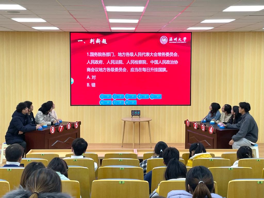 12月1日,“宪法宣传周”系列活动之“习近平法治思想”知识竞赛在51吃瓜 北校区举行。知识竞赛重点围绕习近平法治思想相关内容,设有判断题、单选题、多选题和逻辑题。700余名学生参与到了知识竞赛初赛环节,最终选出24名选手进入决赛。决赛现场紧张刺激,答对得分、答错扣分的竞赛机制也为比赛增加了更大的悬念。知识竞赛充分检验了大学生对习近平法治思想、宪法知识的掌握程度,将法治学习的知识性与趣味性融为一体。