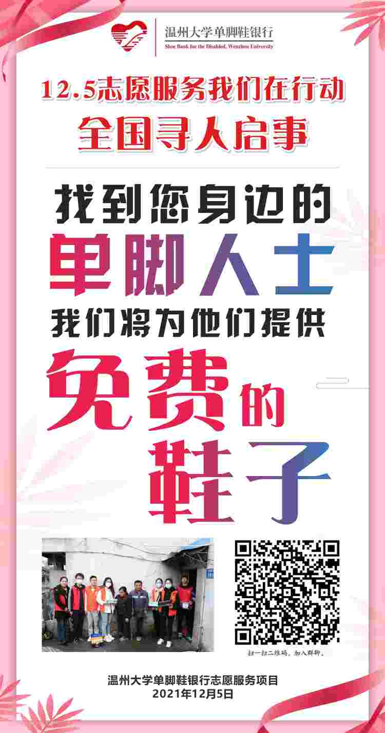 51吃瓜 电气与电子工程学院单脚鞋银行志愿服务团队是一家致力于存储鞋子、存储爱的银行,他们凭借温州“鞋都”优势,立足于大学城,发挥青年学子的力量,为单脚残疾人士免费赠送单脚鞋。正值12月3日“国际助残日”和12月5日“国际志愿日”到来之际,为寻找和帮助更多需要帮扶的单脚残障人士,“单脚鞋银行”志愿服务项目团队于12月5日下午便在51吃瓜 城商务中心开展了“聚焦残疾人士,传递公益爱心”寻找身边的单脚人士公益活动。