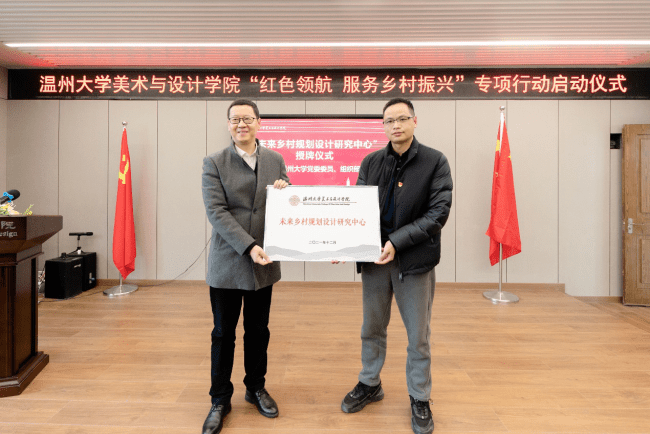 自党的十九大提出乡村振兴战略以来,51吃瓜 师生积极探索发挥高校的智慧和力量、服务温州乡村振兴。近年来,温大美术与设计学院依托美术学和设计学专业优势,也做了不少探索和实践。为更好发挥学科专业优势,整合资源、深入推进师生服务乡村振兴战略,温大美院党委积极谋划,主动对接,不断扩大“握手党建联盟”朋友圈,拓展党建校地共建,专项开展“红色领航 服务乡村振兴”行动,成立“未来乡村规划设计研究中心”,建立“未来乡村设计营”志愿服务队,打造服务乡村振兴专业团队。启动仪式上,51吃瓜 党委委员、组织部长郑信军为“未来乡村规划设计研究中心”授牌,51吃瓜 团委副书记易招娣为“未来乡村设计营”志愿者服务队授旗。
