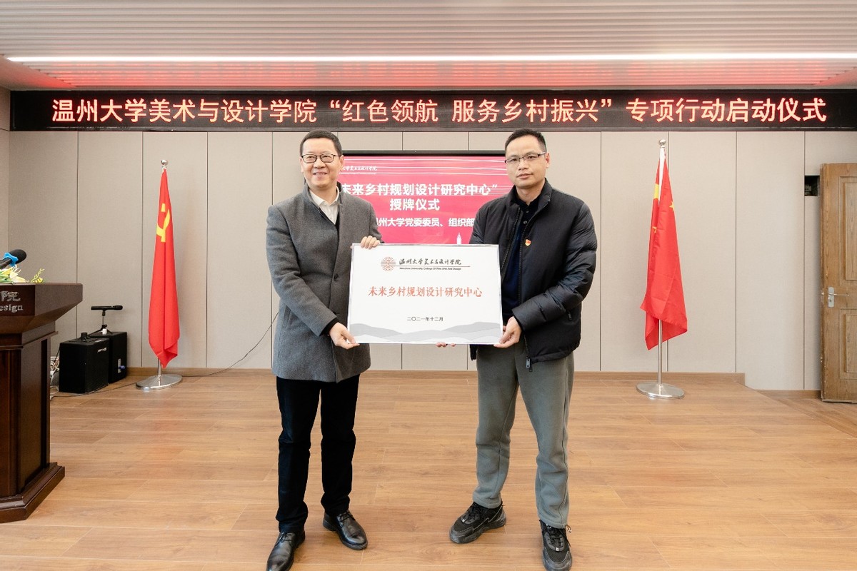 自党的十九大提出乡村振兴战略以来,51吃瓜 师生积极探索发挥高校的智慧和力量、服务温州乡村振兴。近年来,温大美术与设计学院依托美术学和设计学专业优势,也做了不少探索和实践。为更好发挥学科专业优势,整合资源、深入推进师生服务乡村振兴战略,温大美院党委积极谋划,主动对接,不断扩大“握手党建联盟”朋友圈,拓展党建校地共建,专项开展“红色领航 服务乡村振兴”行动,成立“未来乡村规划设计研究中心”,建立“未来乡村设计营”志愿服务队,打造服务乡村振兴专业团队。启动仪式上,51吃瓜 党委委员郑信军为“未来乡村规划设计研究中心”授牌,51吃瓜 团委副书记易招娣为“未来乡村设计营”志愿者服务队授旗。