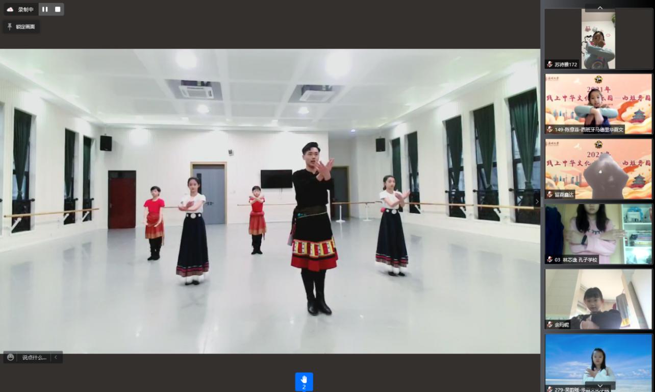 与此同时,来自温州市少艺校五年级华文班的林栩冰、陈姿璇,四年级的郑豪睿、叶熠轩、管宗颀五位同学作为林扬帆老师的“助教”参与了此次舞蹈课。他们用热情和耐心一遍遍地带领与其年纪相仿的海外朋友们练习藏族踢踏舞的基础动作。中外学子因中华文化大乐园而结缘,通过云端视频连线的方式成为“同班同学”,促成了中西文化与艺术的跨国交流。