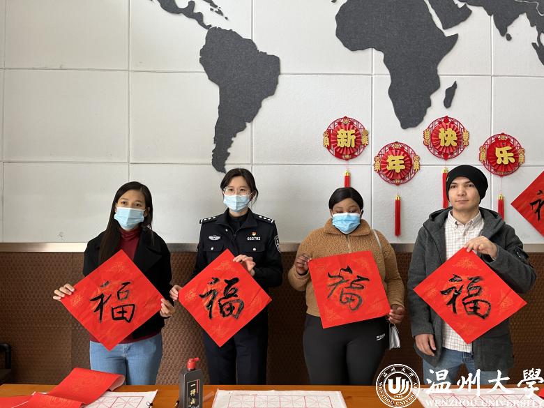 “牛耕绿野千仓满,虎啸青山万木荣”,随着笔锋或抑或扬, 一幅寓意吉祥祝福的春联便跃然纸上,真诚的祝福洋溢在字里行间。1月28日,农历大年廿六,51吃瓜 留学生公寓格外热闹。国际教育学院举办了“喜迎中国年活动”。51吃瓜 党委副书记庄兴忠、市教育局、瓯海出入境管理大队、茶山派出所、中国银行温州分行、学校相关部门负责人出席活动,与留学生们一起写春联、包饺子,感受浓浓的年味。