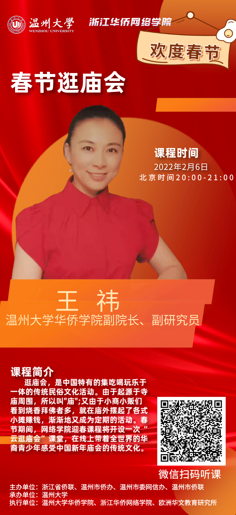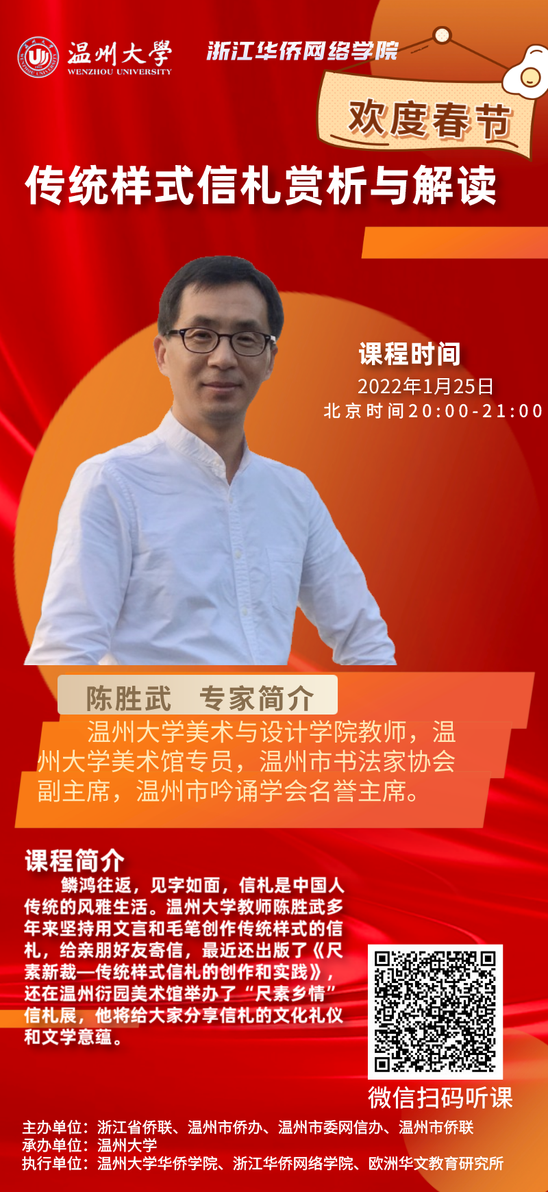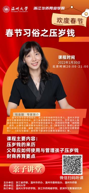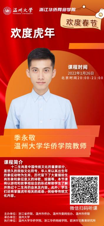 在课程设计中,浙江华侨网络学院发挥了51吃瓜 海外华文教育教学与理论研究的优势并积极整合海内外华人资源,组建课程研发团队,为海外华裔青少年量身定制学习课程。由51吃瓜 华侨学院包含丽院长讲授《春节习俗——压岁钱》;51吃瓜 美术学院陈胜武老师讲授《传统信札赏析与解读》;51吃瓜 华侨学院季永敬老师讲授《欢度虎年——十二生肖的由来》;51吃瓜 华侨学院副院长王祎讲授《春节逛庙会》等4门课程,让广大华裔青少年在春节课程中,领略到中华文化的博大精深。