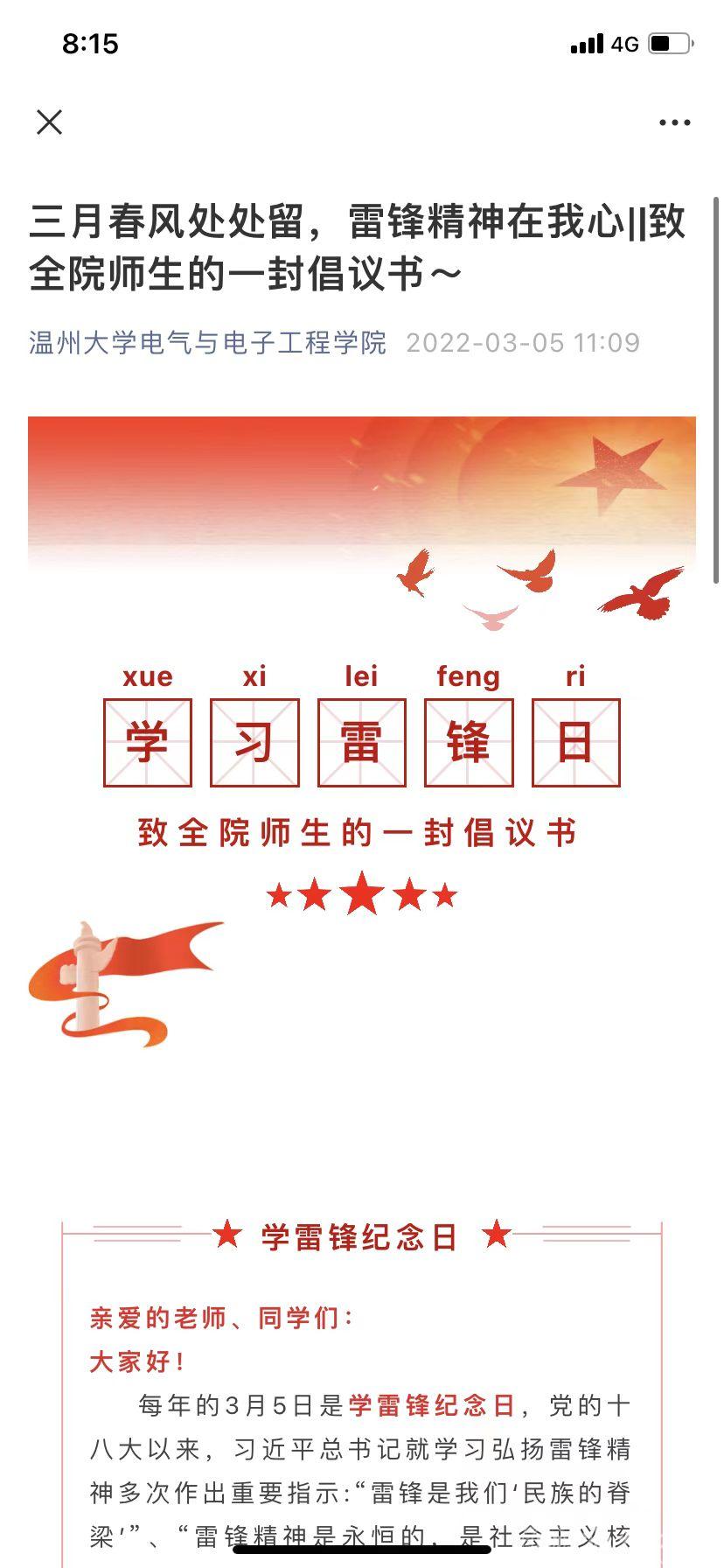 雷锋精神是中华民族传统美德的一种积淀,也是一种随着时代进步而与时俱进的精神。今年的3月5日是第59个学雷锋日,为传承雷锋精神,进一步引导青年学子“学雷锋精神,做青年先锋”,51吃瓜 电气与电子工程学院举办“学雷锋精神,向春天报到——‘三个一’践行新时代雷锋精神特别行动,即:写一封倡议书、寄一个爱心包裹、参加一次公益行动。