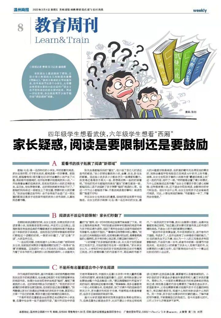 “不是所有的名著都适合给思想还未成熟的中小学生看,名著中也会有一些不适宜的内容。”温州市实验中学语文老师周锋举例,中国四大名著《水浒传》中有大量表现暴力倾向的描写,感觉是在宣扬暴力,这时,老师就会建议学生要结合整个作品去解读人物。“要正确理解时代所留存下来的烙印,理性辩证地看待问题。”周锋解释,很多名著都有一个核心点和精华点,在阅读前,除了对课外书的选择进行把关之外,家长最好先和孩子沟通,书里哪些点是值得看的,给孩子正面细致的阅读引导。