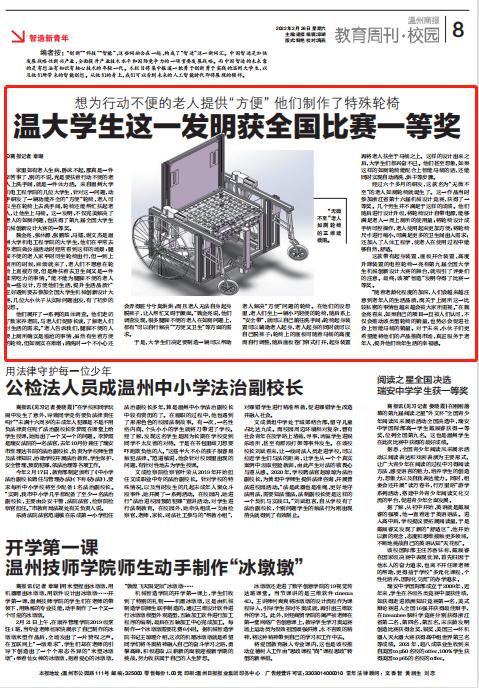 经过六个多月的研发,这款名为“无微不至”的老人如厕轮椅就诞生了。这一作品当时参加浙江省第十六届机械设计竞赛,获得了一等奖。几个男生并不满足于这样的成绩。他们随后进行设计升级,将轮椅设计自带电源,能够满足老人一周上厕所的使用量;将轮椅设计成手柄可控操作,老人使用起来更加方便;将轮椅尺寸进行缩小,可满足更多的卫生间出入需求;还加入了人体工程学,使老人在使用过程中能够自然、舒适。