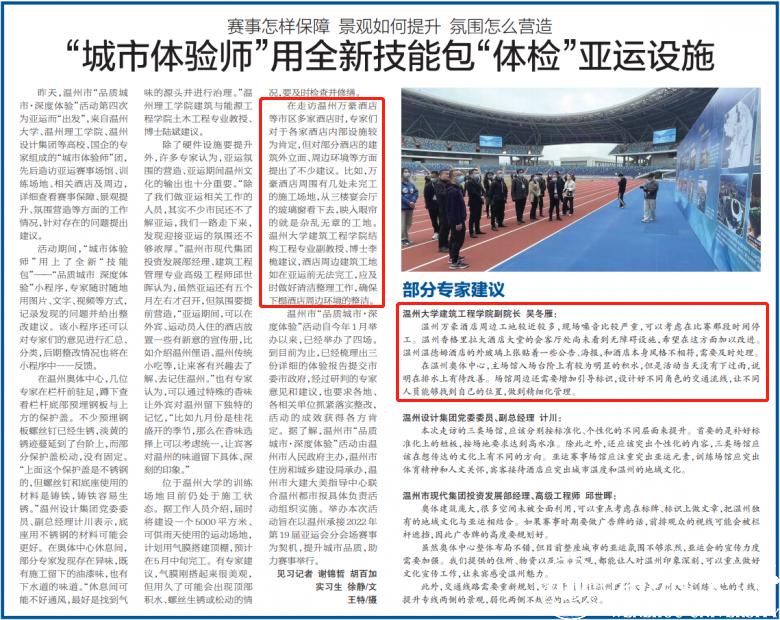 温州市“品质城市·深度体验”活动自今年1月举办以来,已经举办了四场。到目前为止,已经梳理出三份详细的体验报告提交市委市政府,经过研判的专家意见和建议,也要求各地、各相关单位抓紧落实整改,活动的成效获得各方肯定。据了解,温州市“品质城市·深度体验”活动由温州市人民政府主办,温州市住房和城乡建设局承办,温州市大建大美指导中心联合温州都市报具体负责活动组织实施。举办本次活动旨在以温州承接2022年第19届亚运会分会场赛事为契机,提升城市品质,助力赛事举行。