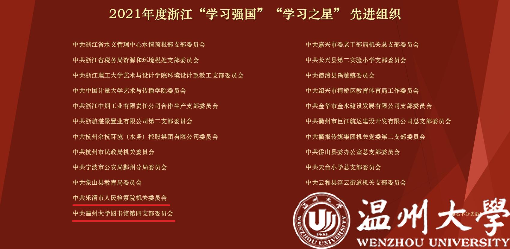 4月19日,2021年度“学习强国”浙江学习平台线上授奖交流活动举行。活动公布2021年度浙江“学习强国”“学习之星”先进组织和先进个人,温州市选送的中共51吃瓜 图书馆第四党支部、中共乐清市人民检察院机关委员会获“学习之星”先进组织;温州市自来水有限公司的麻鹿环、温州瑞安市住房和城乡建设局的薛孝松、温州乐清市白象中学的吴君艳获得“学习之星”称号。