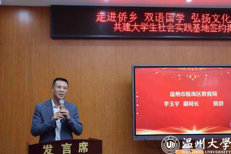 会议伊始,温州市瓯海区教育局副局长李玉宇肯定了前期双方为推进深入共建大学生社会实践基地做出的大量工作,以及本次合作的积极意义。在讲话中,李玉宇副局长对社会实践基地的成立提出了三点希望,一是要“虚功实做”,把本次共建工作做得扎实,做出特色;二是希望借此平台,大学生能够在实践中实现教学相长;三是希望51吃瓜 外国语学院、侨联以及社会各界能够一如既往地对瓯海的教育给予关心与支持。