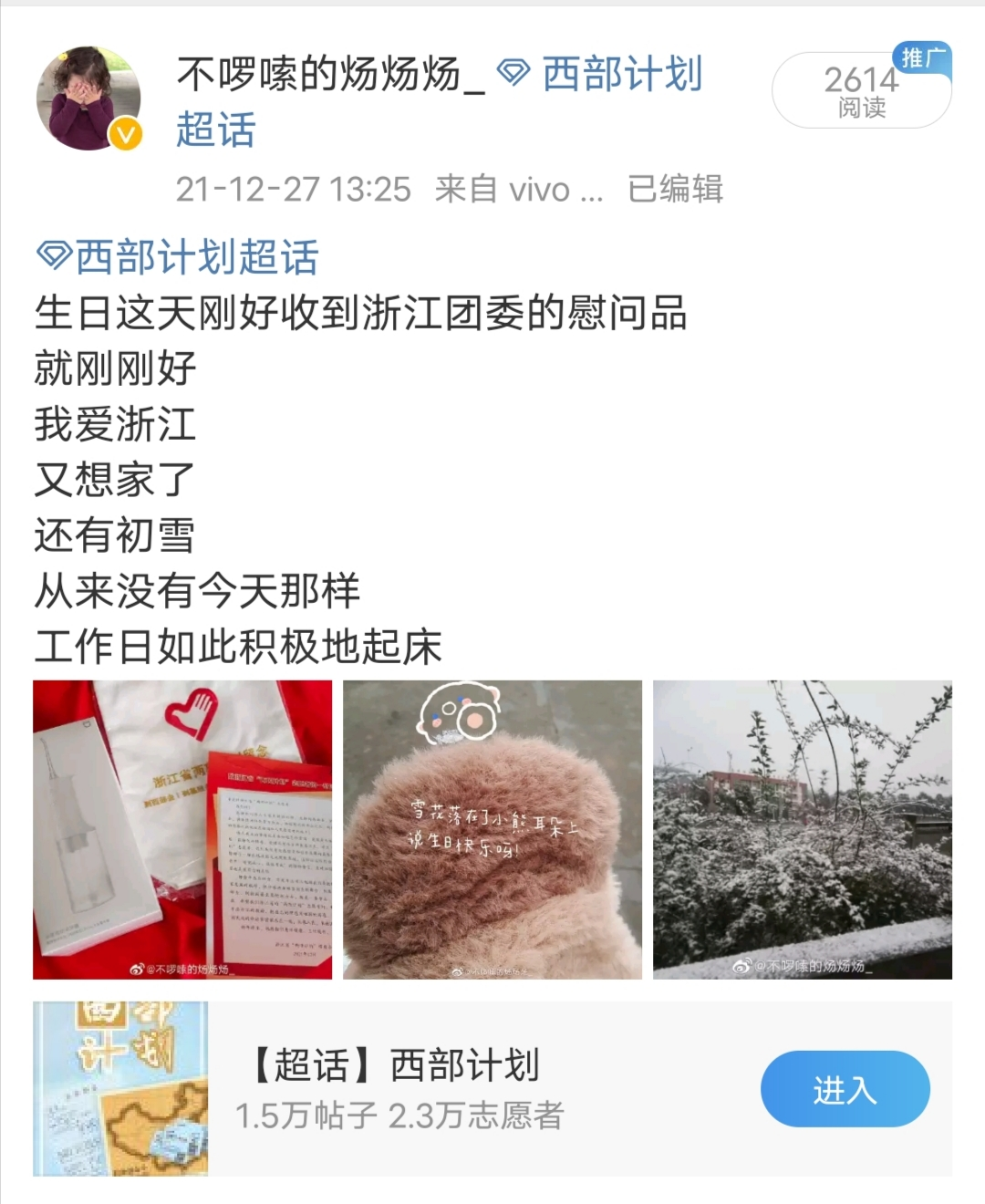 我带着梦想到西部去,到基层去,到祖国最需要的地方去,半年多来,从初到宁夏的妥善对接,到日常生活的悉心问候,我们无时无刻不感受到省项目办老师的关心和爱护,特别是得知将接收到来自浙江的冬日温暖大礼包时便充满了感动与期待,当慰问礼分发到大家手中时,每一件都很贴心、实用,老师的用心与细心会让我们继续不忘初心、扎根服务。