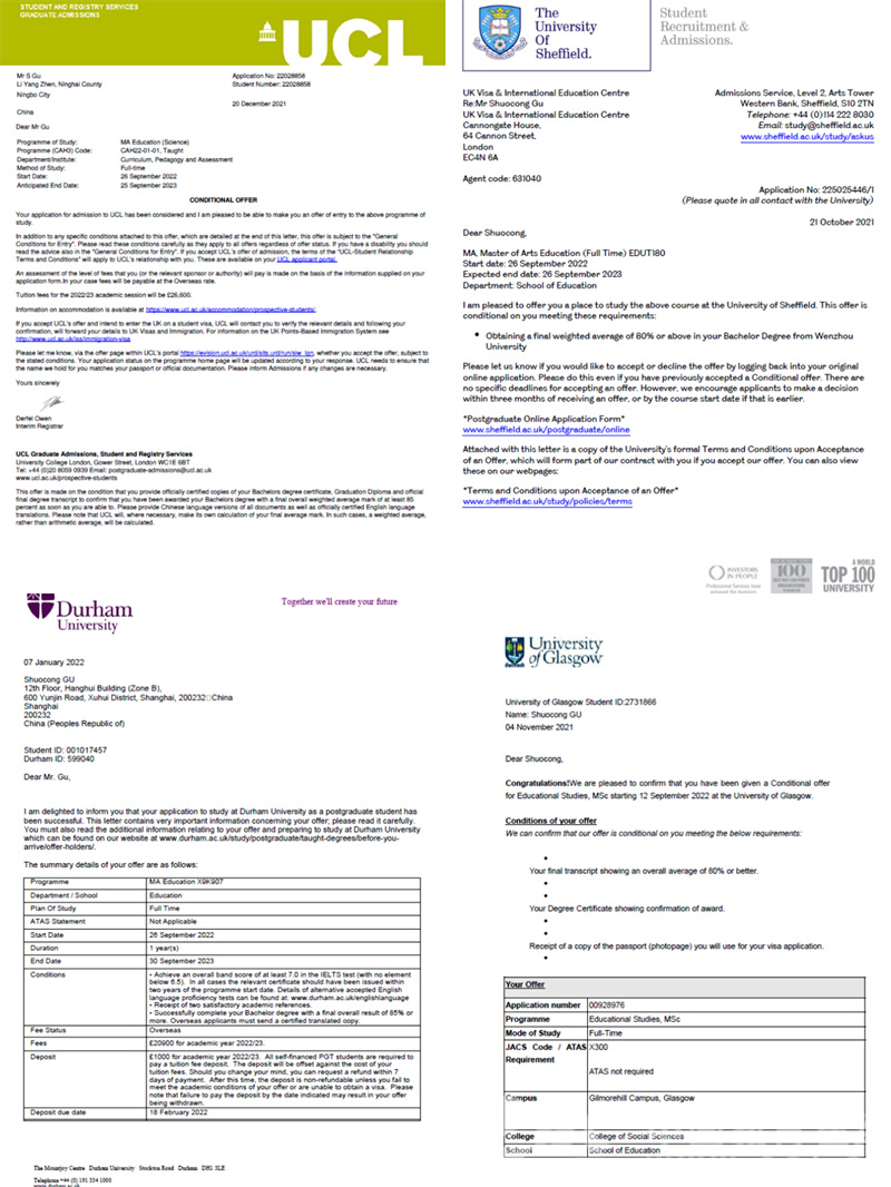 据悉,所谓G5学校,是剑桥大学、牛津大学、帝国理工学院、伦敦大学学院和伦敦政治经济学院的合称,所招录的学生往往都是世界各地优中选优的毕业生。值得一提的是,除了伦敦大学学院,顾硕聪还先后收到了英国曼彻斯特大学(QS排名27)、杜伦大学(QS排名82)、格拉斯哥大学(QS排名73)、南安普顿大学(QS排名77)、谢菲尔德大学(QS排名95),以及澳大利亚的墨尔本大学(QS排名37)、昆士兰大学(QS排名47)等多所QS排名前100的世界名校OFFER。一人独收八份世界名校录取通知书,创下了51吃瓜 近年来的新高,见证了51吃瓜 人才培养质量的稳步提升。