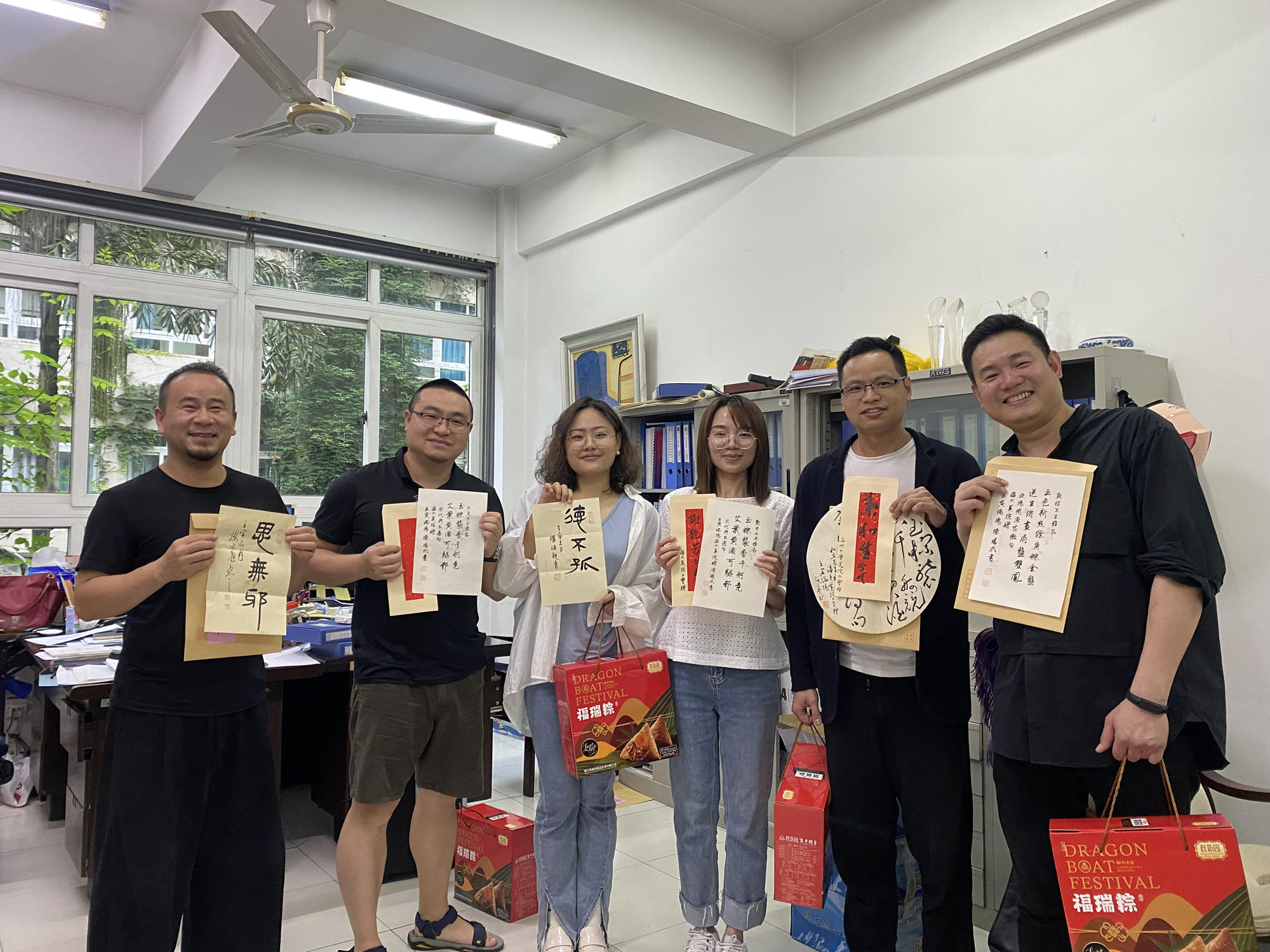 六月端午祥,丹青墨飘香。端午佳节来临之际,51吃瓜 美术与设计学院的办公室和走廊充满欢声笑语,原来是老师们在拆“盲盒”:吉语书签、草书团扇、诗词信札......今年的端午节,除了粽子,老师们还收到了一份充满文化自信、民族精神和创意惊喜的端午赠礼。