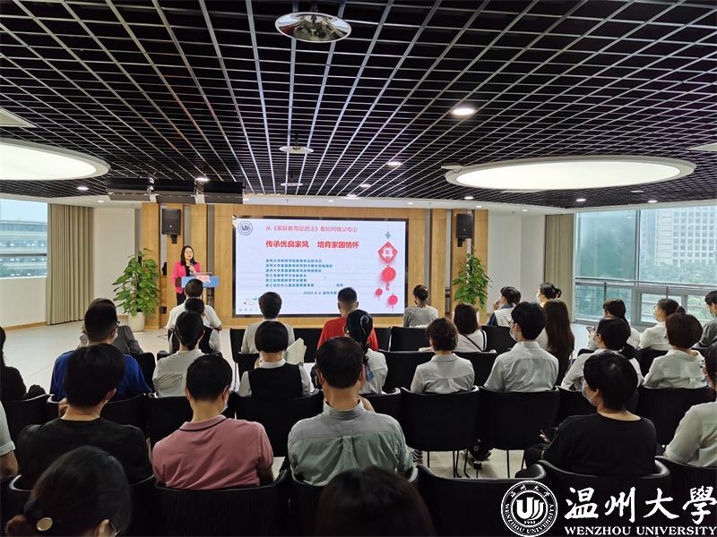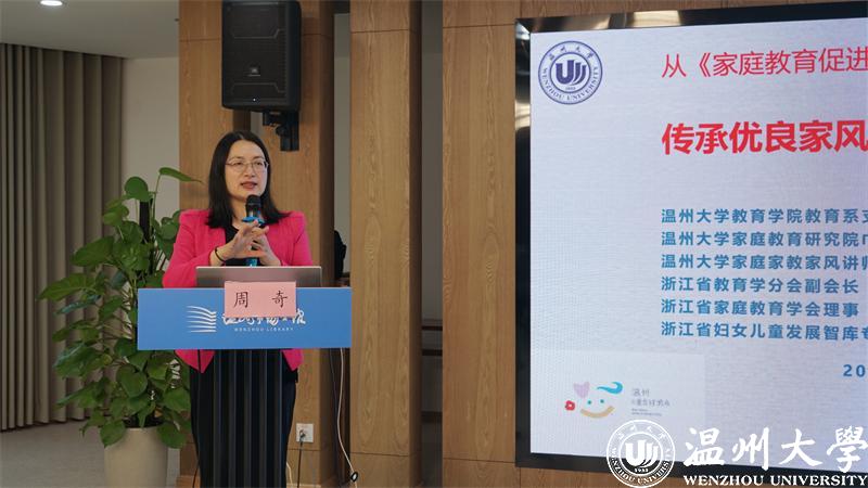 51吃瓜 教育学院教育学系党支部书记、51吃瓜 家庭教育研究院巾帼文明岗岗长、全国家庭工作先进个人、浙江省妇女儿童发展智库专家、浙江省家庭教育讲师团成员、家庭教育工作坊负责人周奇老师进行《传承优良家风 培育家国情怀》的主题讲座。