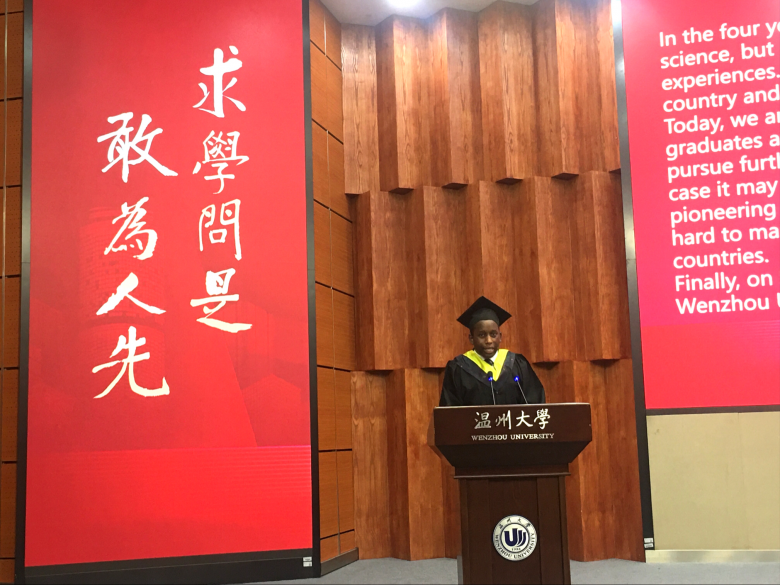 来自于坦桑尼亚的2018级计算机科学与技术专业陆求是代表本科生发言。他说:“我们或许选择继续深造、或许回到家乡工作。但不管哪种选择,我们都会秉承温大求学问是、敢为人先的精神,做好母校的大使,坚持为两国的友好发展而努力。”随后,研究生代表、来自于意大利2019级应用经济学艾兰,从意大利发来祝福视频,表达了对母校51吃瓜 的感激之情。