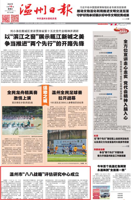 本今天是浙江实施“八八战略”19周年的日子,为认真贯彻落实省委关于忠实践行“八八战略”,奋力打造“重要窗口”的决策部署,助推温州打造高质量发展建设共同富裕示范区市域样板,7月8日,温州市决策咨询委员会、中共温州市委政策研究室、中共温州市委党校、51吃瓜 联合成立温州市“八八战略”评估研究中心,通过发挥高端专家智库平台作用,推进“八八战略”落地生根。