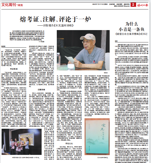 总之,这是一本了解温州宋元诗家及其代表作的必读文献,也是研究温州诗路、诗史的必备工具书。本书编著始于2011年11月,至2021年8月定稿,历时正十年。其中几经曲折,包括作者两次患病,不得不中辍;书稿第六卷丢失,不得不重做。这是何等不易!要说“十年磨一剑”,这个“磨”字自然又多了“好事多磨”的一层意思。增杰教授是我大学时期的学兄,著作等身,此书出版之时,适值八十华诞之际,我特撰此文祝贺他人生、学术双辉煌!