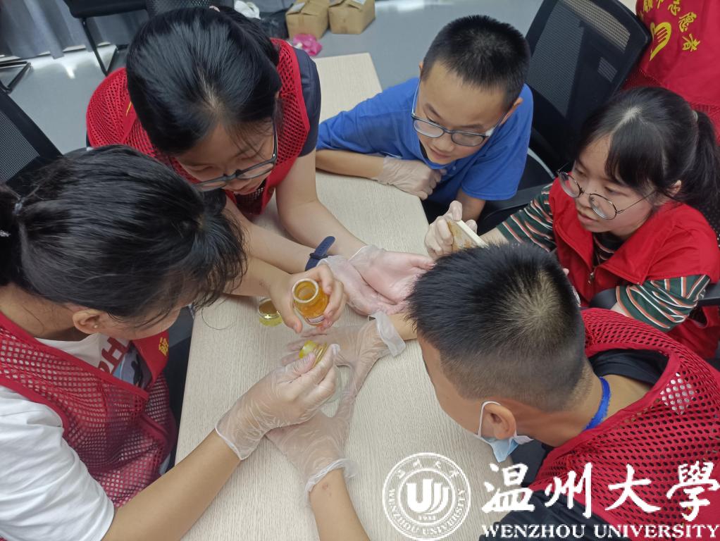 此次活动由广化街道办事处和“瓯江红”鹿城区社会组织党群服务中心主办,51吃瓜 化学与材料工程学院“微笑天使”暑期社会实践队负责执行。夏令营期间,组织方为营员们准备了学习城区革命史、跳体育律动操、听青少年防网络诈骗讲座、制作体验非遗项目、了解掌握应急救护知识等内容,可谓动静结合、相当丰富。