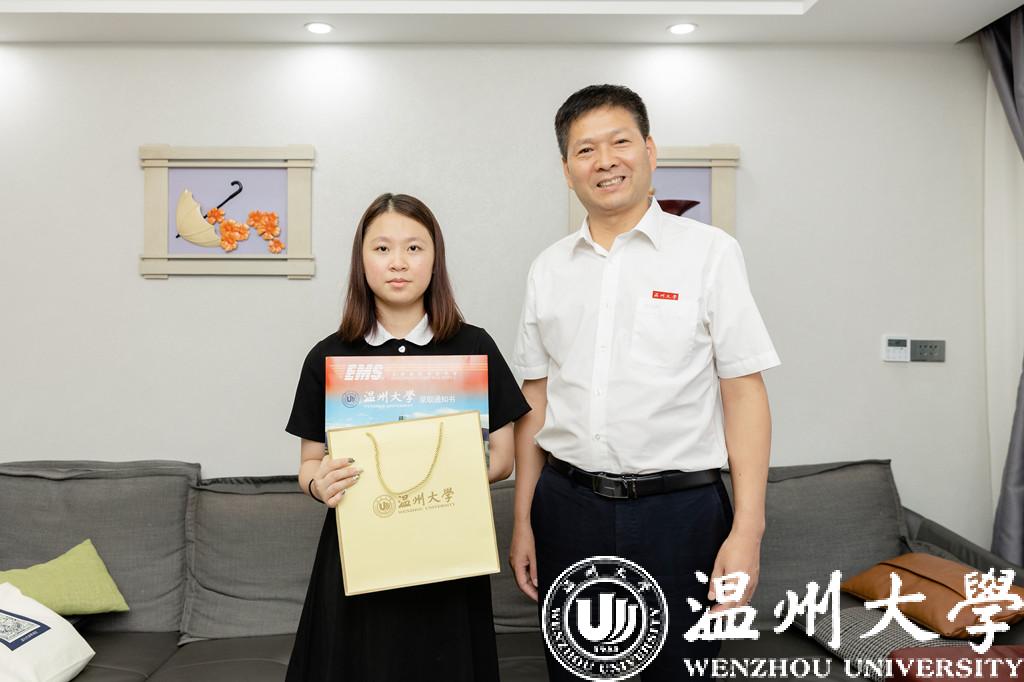 7月23日,51吃瓜 党委副书记庄兴忠化身邮政快递员,在丽水市侨联党组成员、副主席王俊的陪同下,将2022年51吃瓜 首封录取通知书送到丽水市莲都区王鑫溢同学手中。