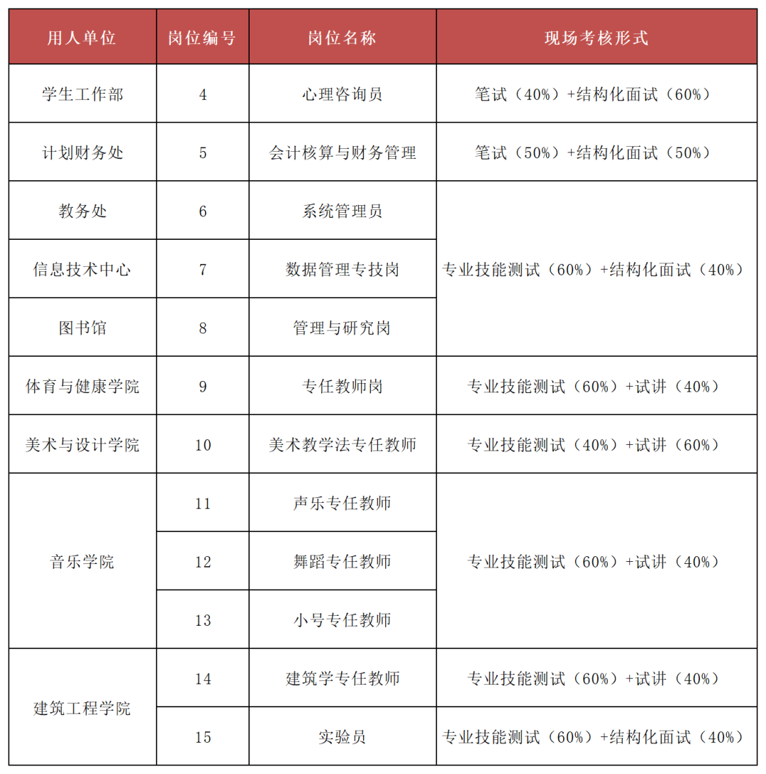 (2)其余岗位的考核方式和分数比例以下图为准,根据报考人员的考核成绩,按照选聘岗位数1:1的比例从高分到低分确定资格复审、体检、考察对象,如遇同分,再加试甄别。