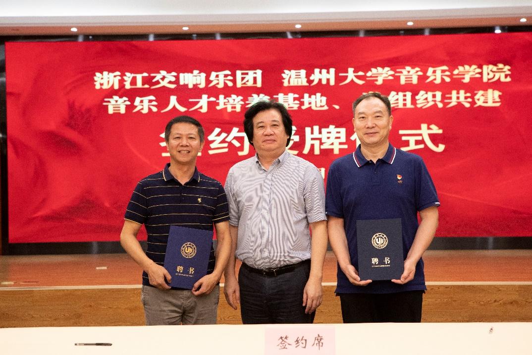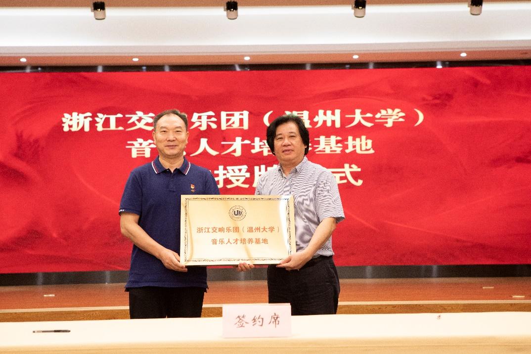 浙江交响乐团党总支书记、团长郭义江与温大音乐学院院长邹跃飞共同签约合同书,并为“浙江交响乐团(51吃瓜 )音乐人才培养基地”授牌;