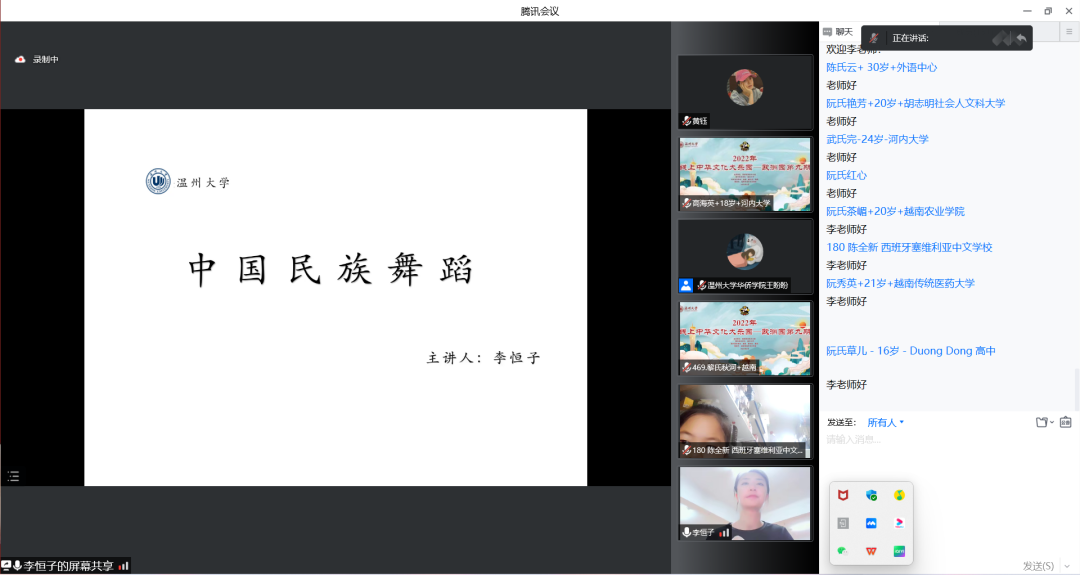 李恒子老师以维吾尔族舞蹈与朝鲜舞为主要教学内容,在专业舞蹈教室架起直播设备,与助教一起为海外华裔青少年们亲身示范舞蹈动作,营造了一个“云端舞蹈课堂”,让学员们宛如亲临舞蹈教室现场,同步学习优美的中国民族舞蹈动作。李恒子老师凭借丰富的教学经验与技巧一步步耐心地引导学员们学习维吾尔族舞蹈与朝鲜族舞蹈的基本动作、熟悉音乐的节奏与韵律、感受中国少数民族传统文化的独特魅力。李恒子老师亲切耐心的教学风格充分调动了学员们参与课堂互动的热情,他们纷纷打开摄像头,精心调整好距离,争相向李老师展示自己的舞蹈练习成果,在云端体验到了沉浸式教学的氛围与乐趣。