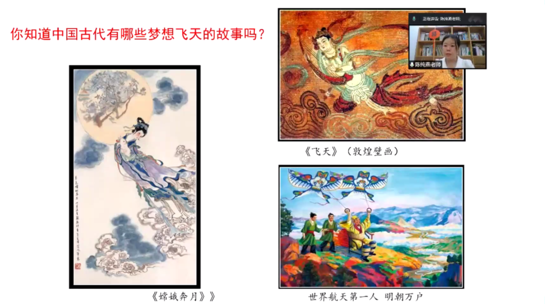 在《学画中国画——星辰大海 向梦而生》的课堂上,温州市教坛新秀、一级教师、来自51吃瓜 城附属学校的陈纯燕老师以《嫦娥奔月》《飞天》(敦煌壁画)等的画作为引,向海外华裔青少年们展示了中国古代人们对于航天梦的憧憬与追求,并介绍了中国航天事业的不断发展与各项重大突破,彰显了中华民族对于“蓝天梦想”的不懈追求与拼搏精神。
