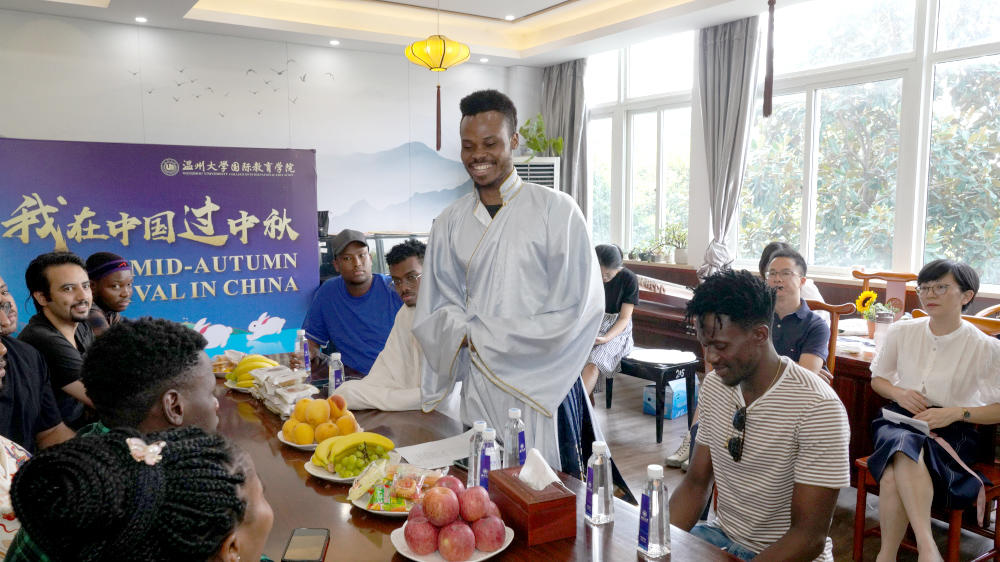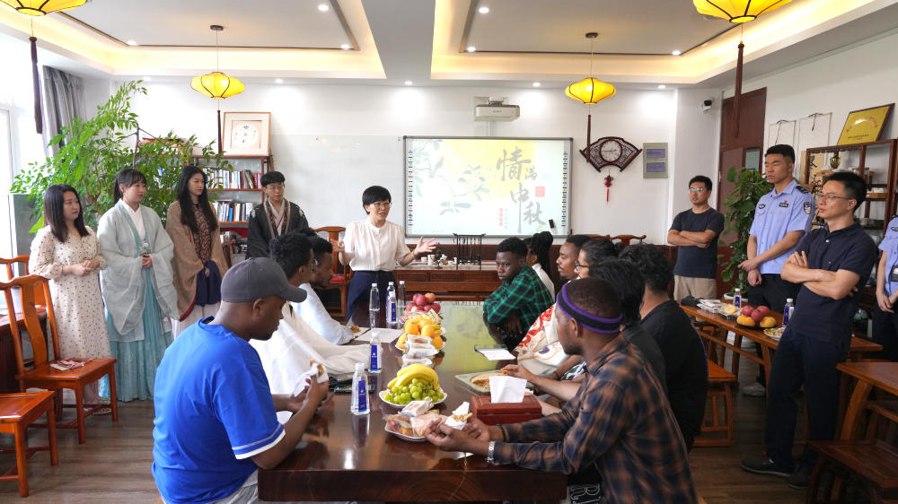 “中秋节又称‘团圆节’,在中国传统文化中有极其重要的意义,中国人自古以来就有赏月团圆的习俗……”当天活动以“我在中国过中秋”为主题,邀请了来自土库曼斯坦、也门、尼日利亚等国的国际学生代表和部分汉语国际教育专业硕士生参加,一边品尝月饼、水果,一边聆听讲解中秋节的起源、风俗习惯,以及它所代表的团圆和思念等含义,学唱歌曲《明月几时有》,现场气氛很是热闹。
