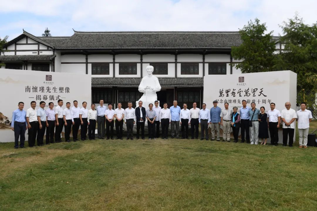 上午九点,南怀瑾先生塑像揭幕仪式在南怀瑾书院三和楼前举行。这座南师全身塑像由著名雕塑艺术家、上海美术学院院长曾成钢先生创作,塑像材质采用优质汉白玉,高3.75米,坐落于三垟湿地五福源公园。