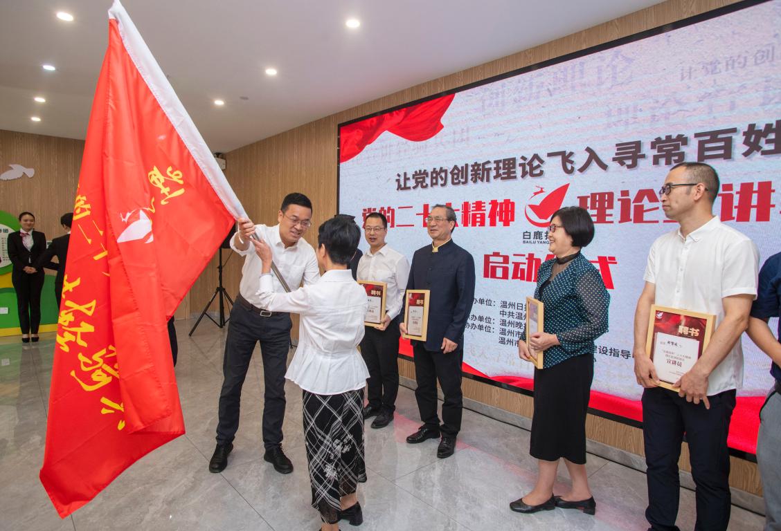 鹿城区委常委、宣传部部长叶恒坚为理论宣讲“轻骑兵”授旗