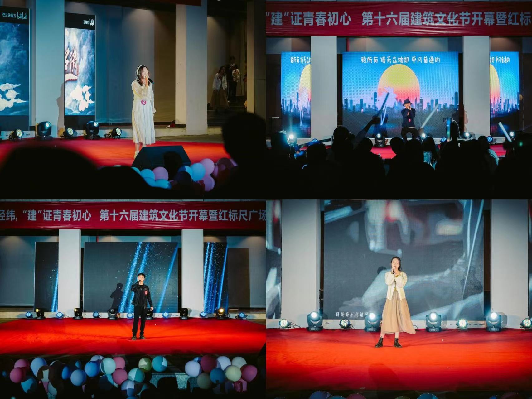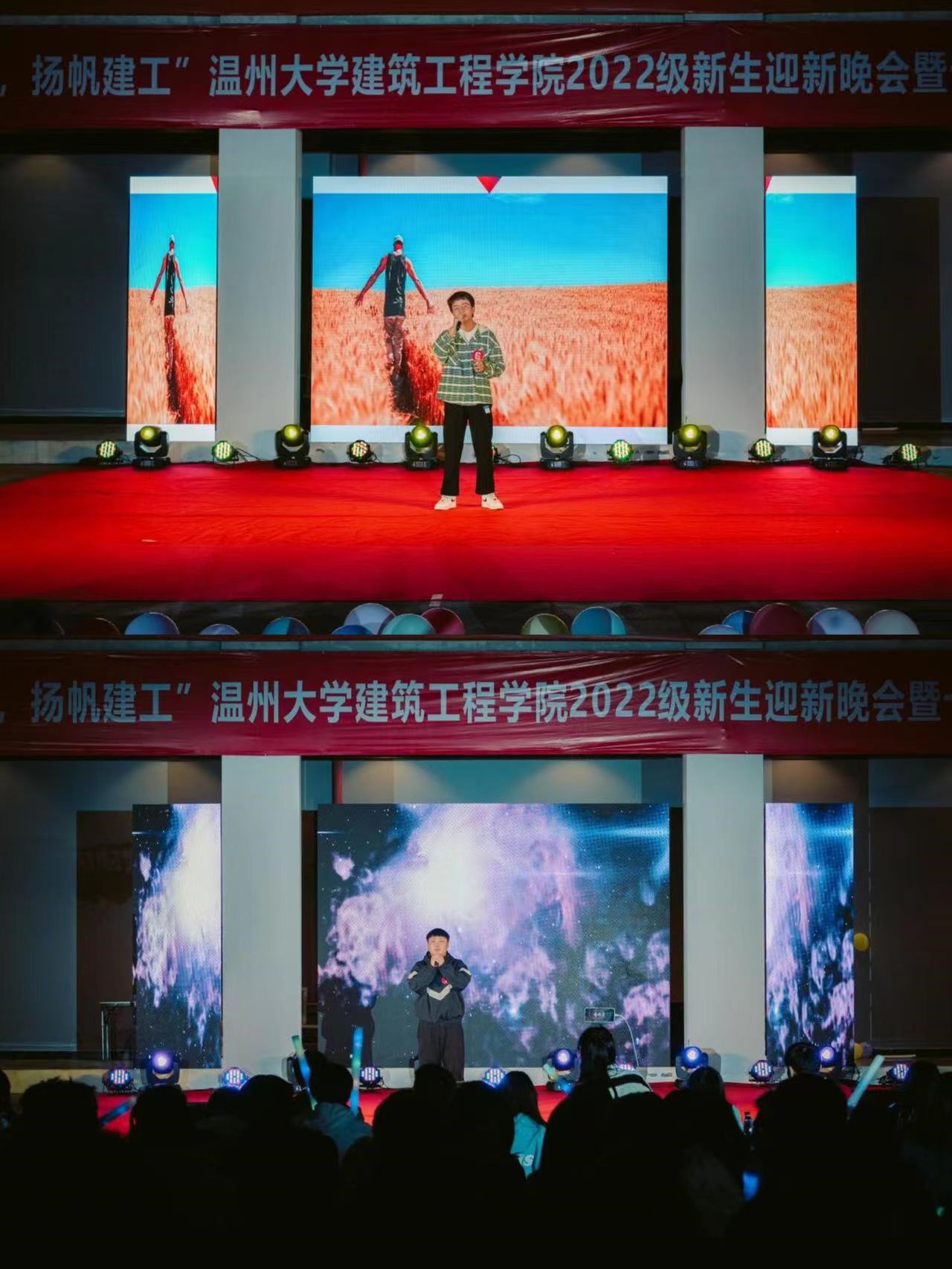 本次迎新晚会共分为三个部分,第一篇章为《青春拂晓,榕树情常》在举行给四年、五年后的自己写一封信的仪式后,建筑学院新生以合唱的形式打开第二篇章《激情演绎,建工风采》,跳跃的音符伴随充满激情的街舞,尽情的释放青春的活力,最后一首朗诵结束了第二篇章。同学们最期待的压轴活动便是第三篇章《遇见青春,音你心动》,作为本届校园十佳歌手大赛的重磅内容,参赛歌手一登场便引来叫好无数。