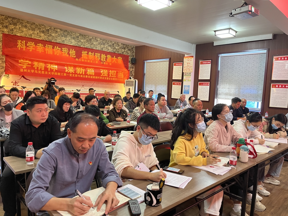 为了掀起党的二十大精神学习热潮,南白象街道党校“博士讲师团”发挥专业特长,梳理教学清单,创新理论宣讲方式,丰富平台载体,深入村社、企业一线,在街道南湖社区、南垟社区、上蔡社区、霞坊社区、横港头社区、鹅湖村、金竹村、白象村八大村社以及街道党群服务中心持续开展专题党课宣讲活动,通过线下讲座+线上直播的方式,让党的二十大精神落地落实、见行见效,实现党的二十大精神宣讲村社全覆盖,形成了全社会学习贯彻党的二十大精神的强大声势和浓厚氛围。