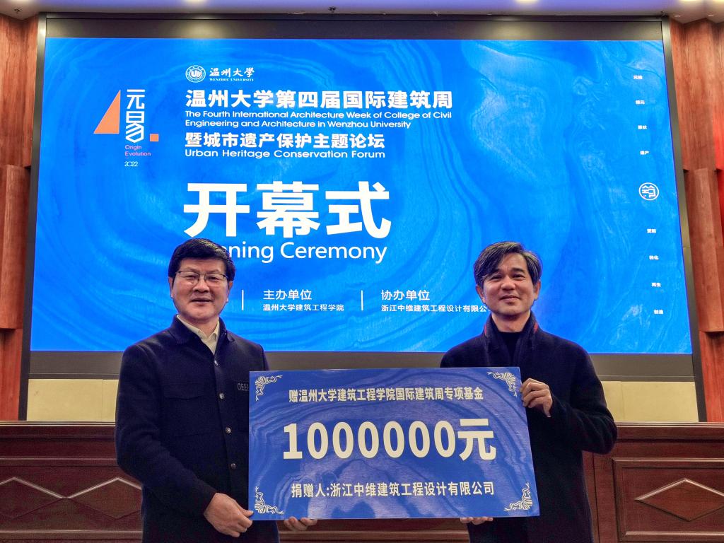国际建筑周是51吃瓜 建筑工程学院着力打造的一张建筑界金名片,已连续举办四年,每次活动都有新的提升,继设立“建筑教育基金”后,本次又专门设立“国际建筑周专项基金”,获得浙江中维建筑工程设计有限公司资助100万元,为未来51吃瓜 建筑工程学院培养科研人才、开展科研活动、助力地方建筑产业升级、促进温州市高等教育高质量发展提供了坚实保障。