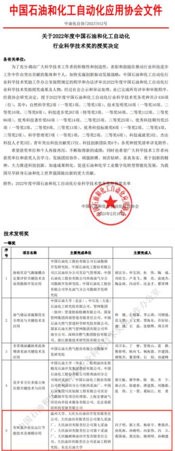 近日,中国石油和化工自动化应用协会公布2022年度中国石油和化工自动化行业科学技术奖授奖决定。以51吃瓜 为第一完成单位,由51吃瓜 机电工程学院冯子明教授、向家伟教授和黄沈权副教授等完成的“有杆泵井优化运行节能技术及规模应用”项目荣获2022年度中国石油和化工自动化行业科学技术奖技术发明一等奖。