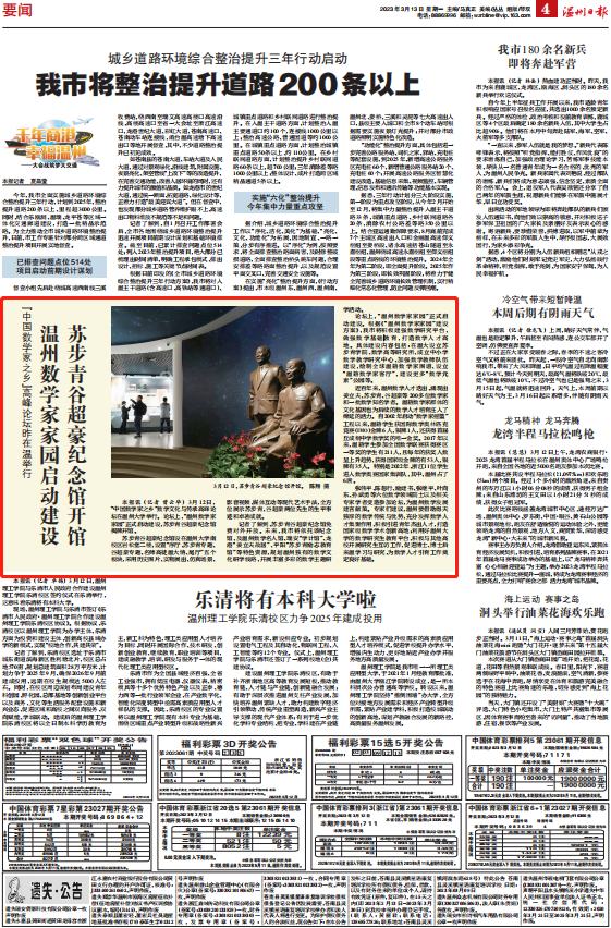 论坛上,“温州数学家家园”正式启动建设。根据《“温州数学家家园”建设方案》,我市将积极建强数学研究平台,做强数学基础教育,打造数学人才高地。具体建设内容包括:在温大设立苏步青学院、数学高等研究所,成立中小学数学教学研究中心、加强数学教师队伍建设,绘制全球温籍数学家图谱、设立“温籍数学家客厅”,建设更多“数学元素”公园等。