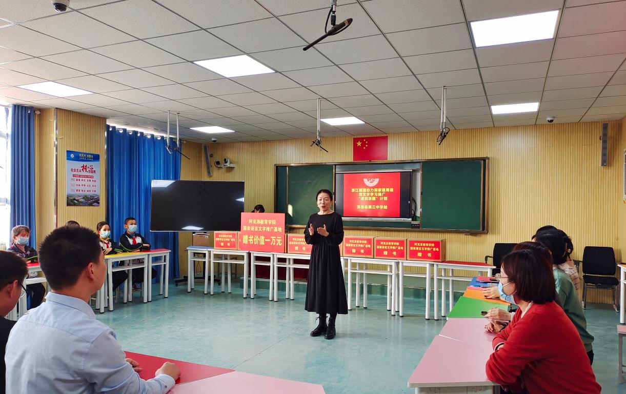 “垚垚俊峭天山,迢迢灵秀瓯江。凝心聚力倾情,推进语润浙疆。”近日,51吃瓜 教育学院援疆教师胡雯圆满结束了从浙到疆的“语润”之旅,满载而归。在学院举行的师德师风专题教育活动上,胡雯老师将她的“西行”故事娓娓道来。此番援疆,她“授人以渔”、育苗培才,也让国家通用语言文字走进城镇乡村,民族团结之花处处盛开。
