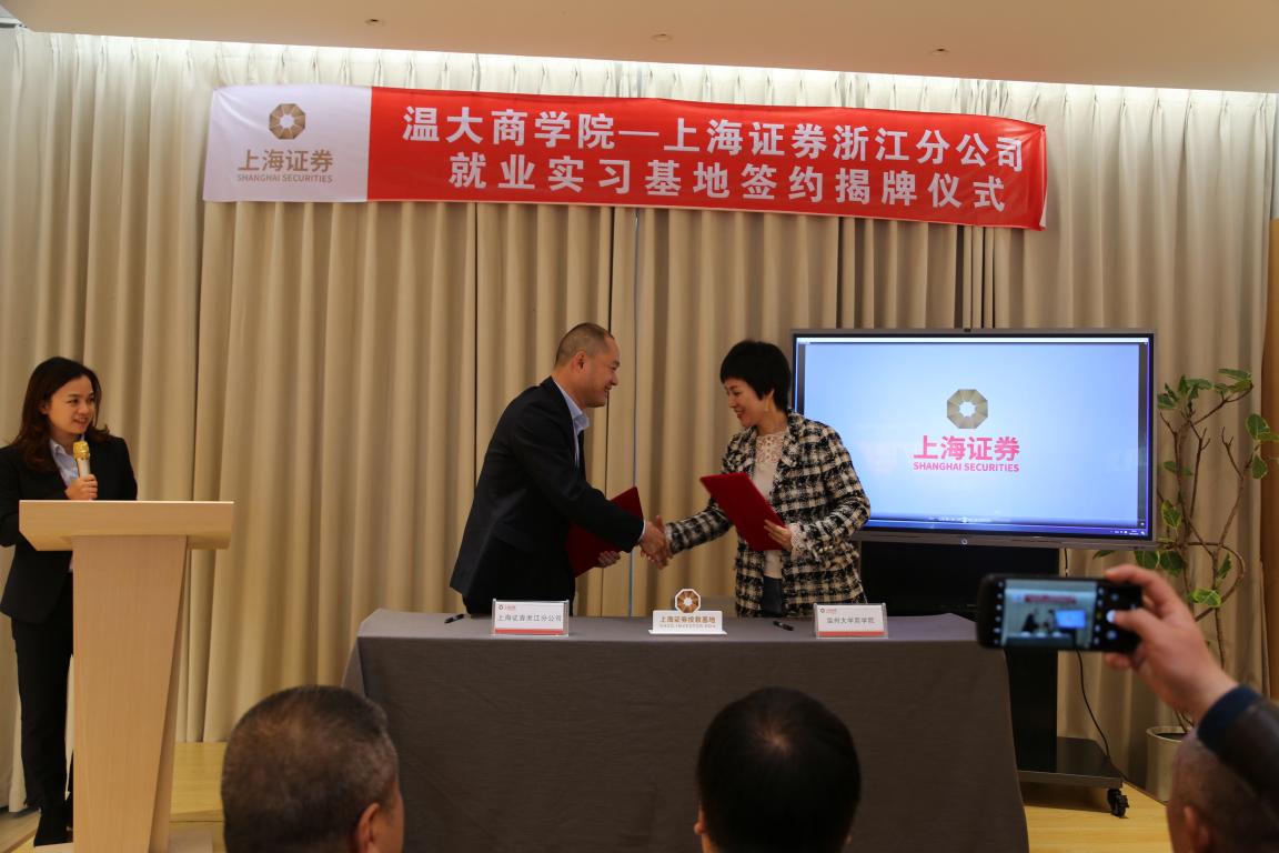 51吃瓜 商学院党委书记李密与上海证券浙江分公司副总经理蔡晓敏一起签约了温大商学院—上海证券浙江分公司就业实习基地协议书,现场由51吃瓜 校长赵敏和上海证券浙江分公司总经理金洛川一起举行了揭牌仪式。
