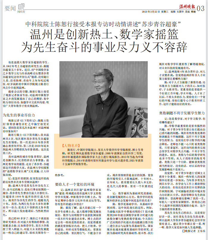 趁着会议的空隙,陈恕行院士接受了晚报记者独家专访,对温州中国数学家之乡的发展提出了自己的期望:集中精力修好内功,加强学术交流和沟通,吸引广大青年数学才俊来到温州。