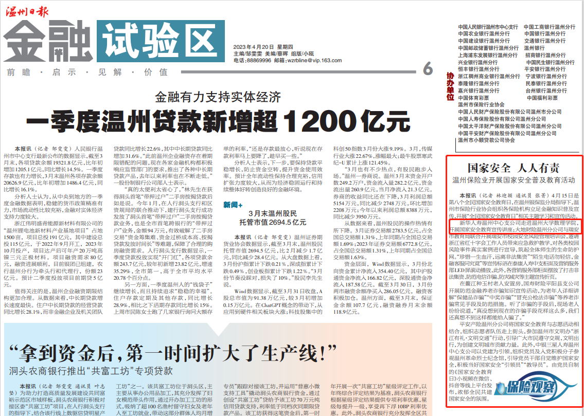 4月15日是第八个全民国家安全教育日,在温州银保监分局指导下,温州市保险行业协会组织各保险机构立足金融知识普及宣传,开展“全民国家安全教育日”相关主题学习和宣传活动。